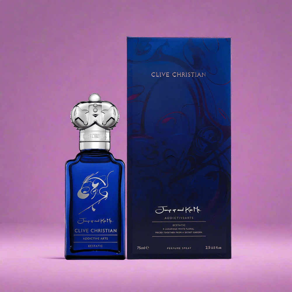 Clive Christian Jump Up & Kiss Me Ecstatic Feminine Parfum – 50ml is an opulent white floral fragrance from the Addictive Arts collection. It opens with vibrant notes of bitter orange and pink pepper, leading to a heart of tuberose, jasmine, and ylang-ylang. The base is a rich blend of amber, sandalwood, tonka bean, and vanilla, creating a warm and sensual scent. With a 25% perfume concentration and crafted using Clive Christian's unique AddictiveFusion technology, this fragrance offers a long-lasting and captivating aroma.
